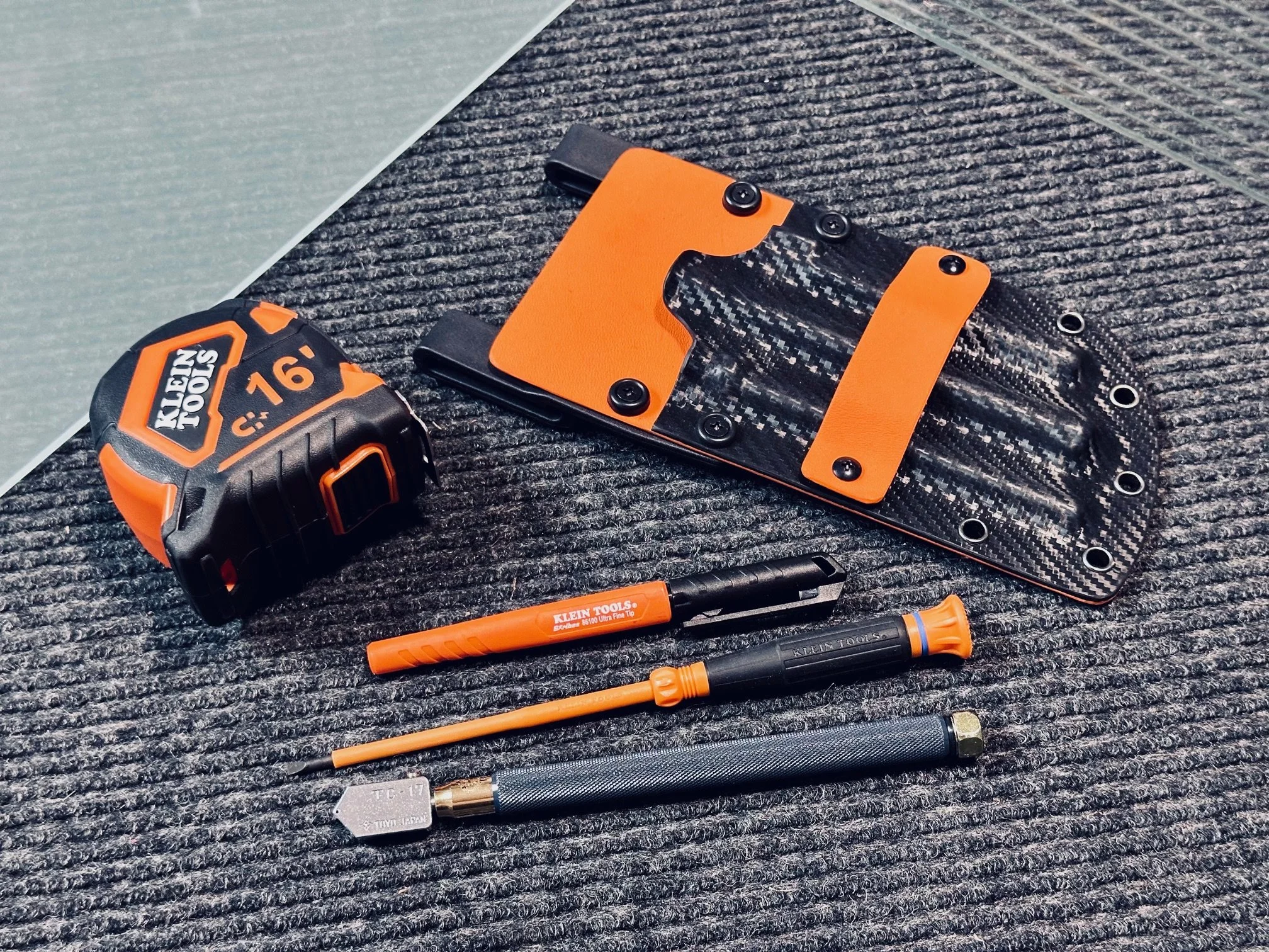 Design your glazier’s pouch to meet to your specific needs - formed to your specific tools. Standard format contains three tool slots; typically one small screwdriver, a glass cutter, and a marker or grease pencil. Slim format contains two tool slots. Many color options to chose from and up to three colors per pouch (back, face, tape measure strap).